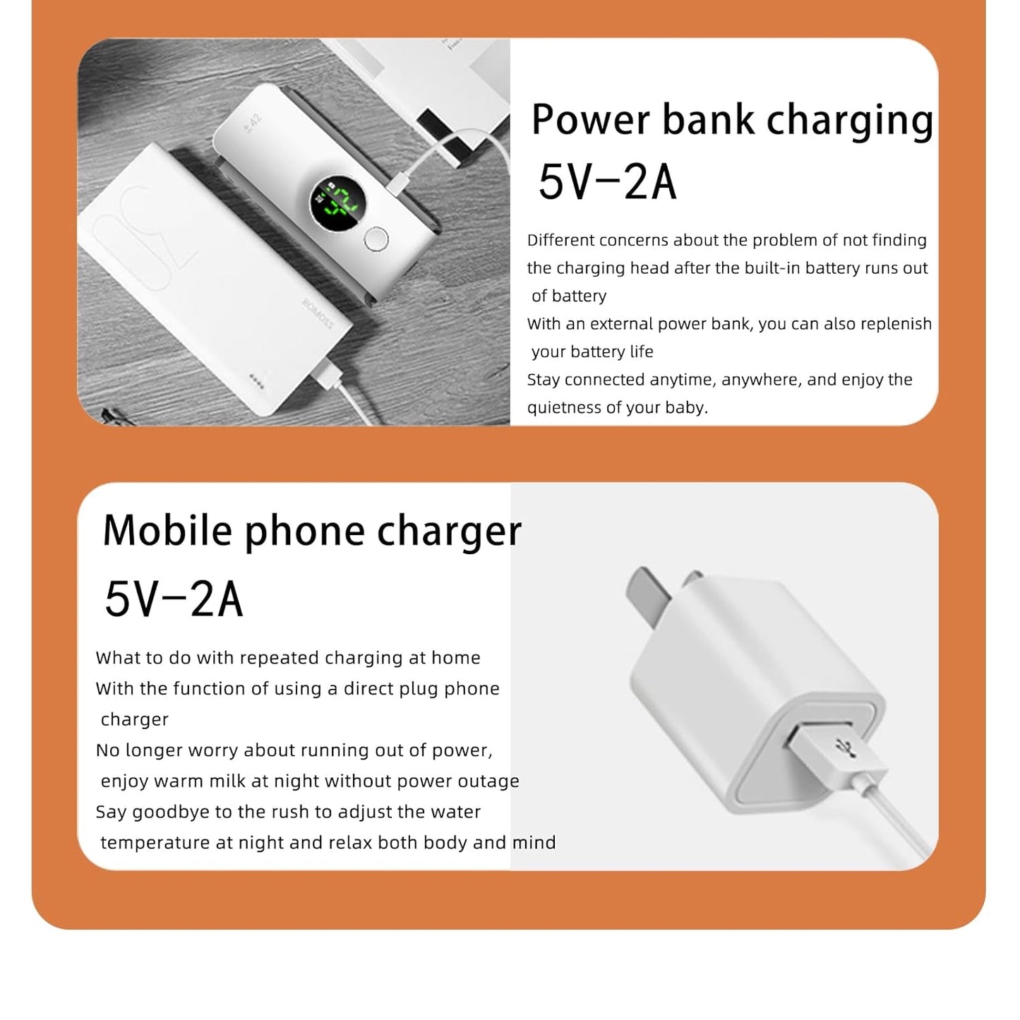 fully compatible with a variety of power sources, compatible with most mobile 5V 2A power supplies. The baby bottle warmer can be used for a portable power bank, charging plug, or car USB interface, which is portable and safe for travel or undisturbed use.